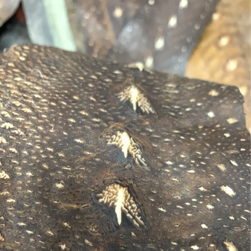 This vegetable-tanned, unfinished Sturgeon leather retains its natural beauty, presenting a raw, organic canvas that can be customized with dyes and finishes. Its adaptability makes it a versatile choice for personalized, creative projects.